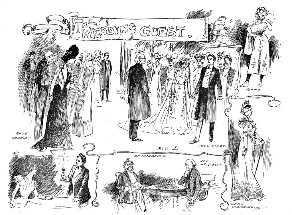 Ellison illustrated the review of JM Barrie’s The Wedding Guest at the New Theatre on page 5 of the Cambridge Graphic, 4 May 1901.