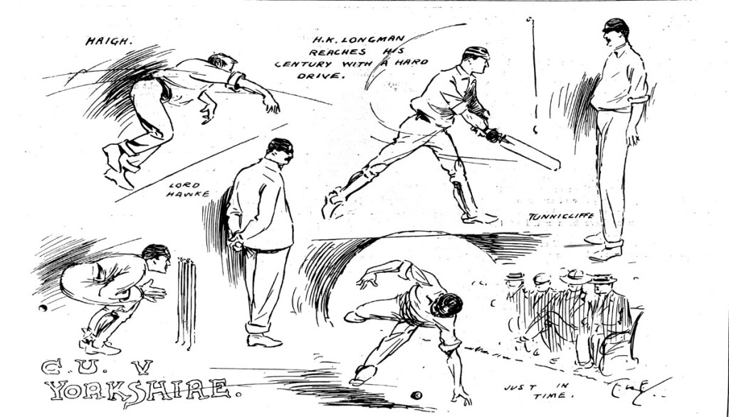 Fine Cricket at Fenner’s was the headline as Cambridge University scored 396 for 9 (Longman, 150) on the first day of their match against Yorkshire, Thursday 23 May 1901: ‘The weather was beautifully fine, though blustering, and there was a capital company.’ Ellison was on hand to capture the action (Cambridge Graphic, 25 May 1901). Cricket enthusiasts amongst our readership will want to know that the match finished in a draw on the Saturday afternoon as Yorkshire fell short of a last-innings target of 161, which they might well have reached had it not ‘been agreed to draw stumps at five o’clock, to allow the Yorkshiremen to get away by an early train’ (Cambridge Independent Press, 31 May 1901, page 5).
