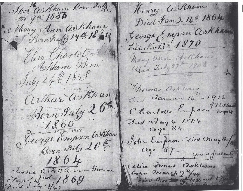 The Askhams’ Bible, inscribed with the family names and dates of birth and death (contributed by the children of Joan Audrey Beatrice Askham Hulm, Albert Askham’s daughter and Thomas Askham’s grand-daughter)